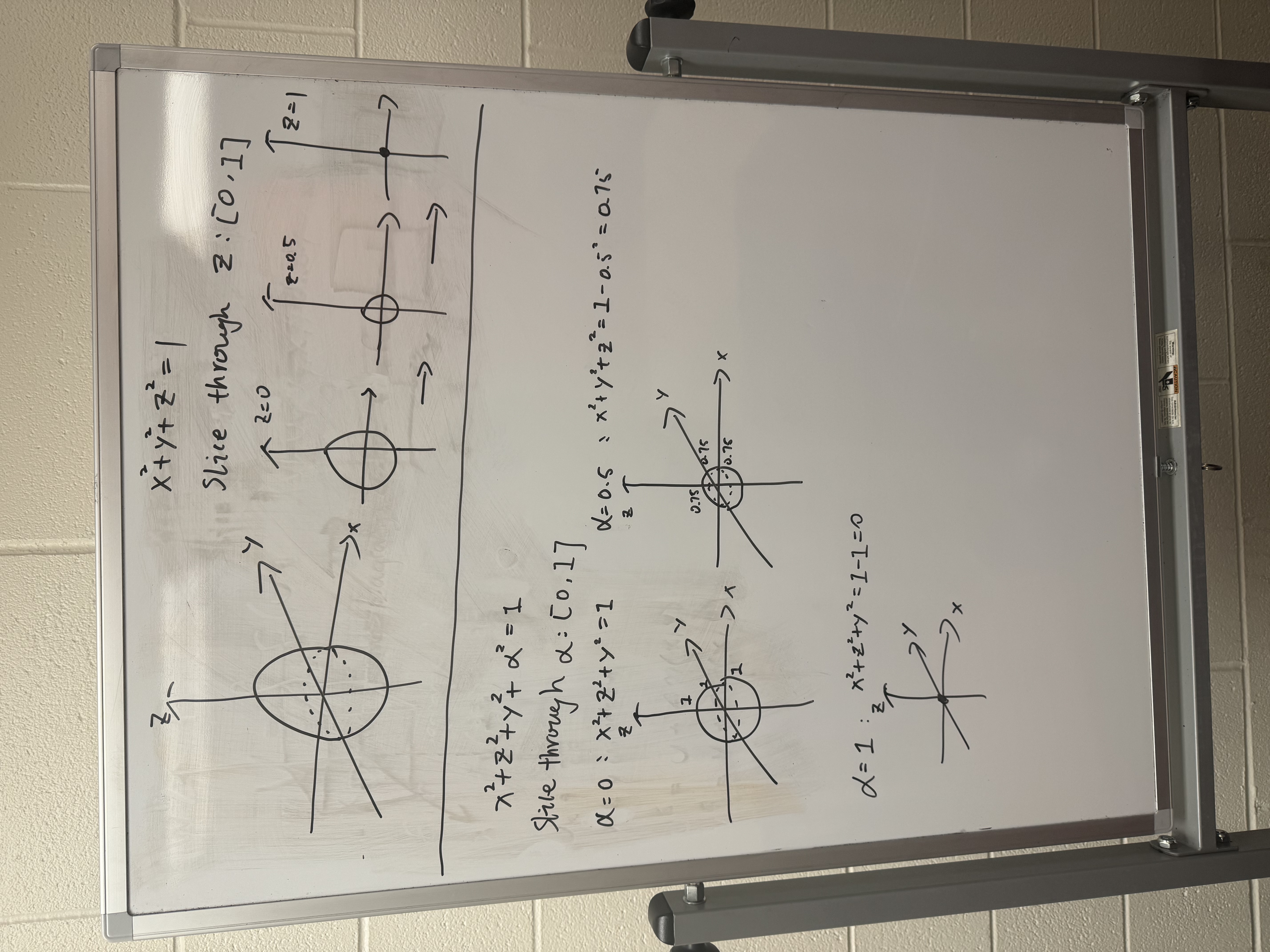 Imagine a ball (a sphere) in three-dimensional space. If we slice the ball with a flat surface, we will see a circle. If we slice through the middle of the ball, the circle will be large. If we move the slice upward, the circle becomes smaller. Eventually, it disappears.