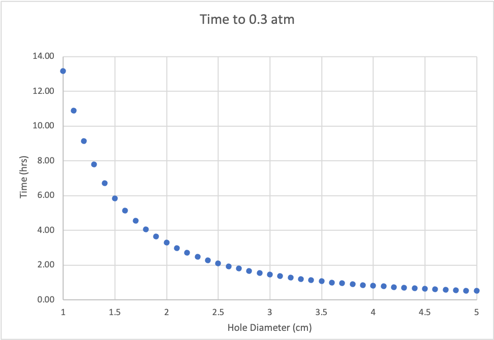 For this instance, we estimated \(C_d = 0.9\), and adjusting this value does not change the relative position of the data points. By running different values of hole diameter through our model, we can graph how different values affect the time it takes to reach 0.3 atmospheres.