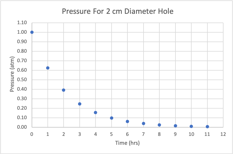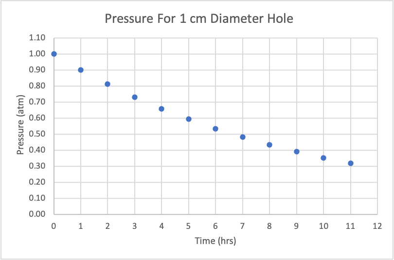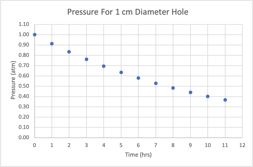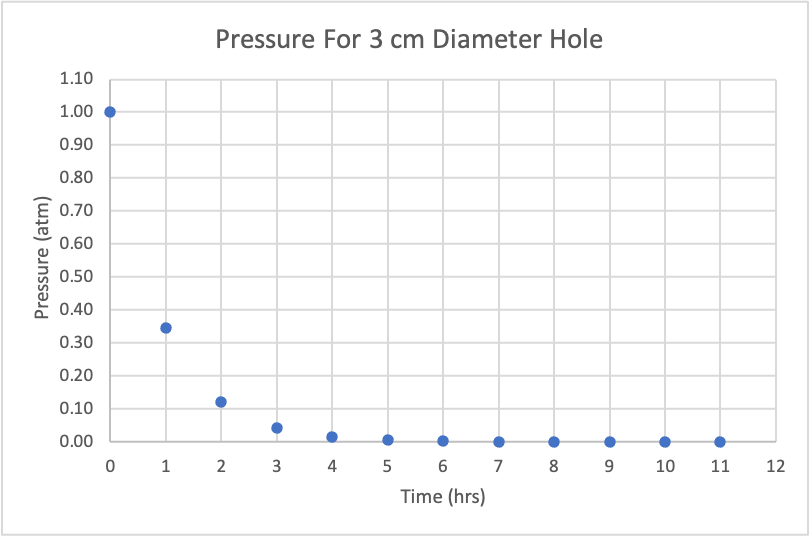 At the end of the day, we found that it takes 10 hours and 15 minutes for the pressure to drop to 0.3 atmospheres, and an increase in the hole’s diameter leads to an exponential decrease in the time it takes.